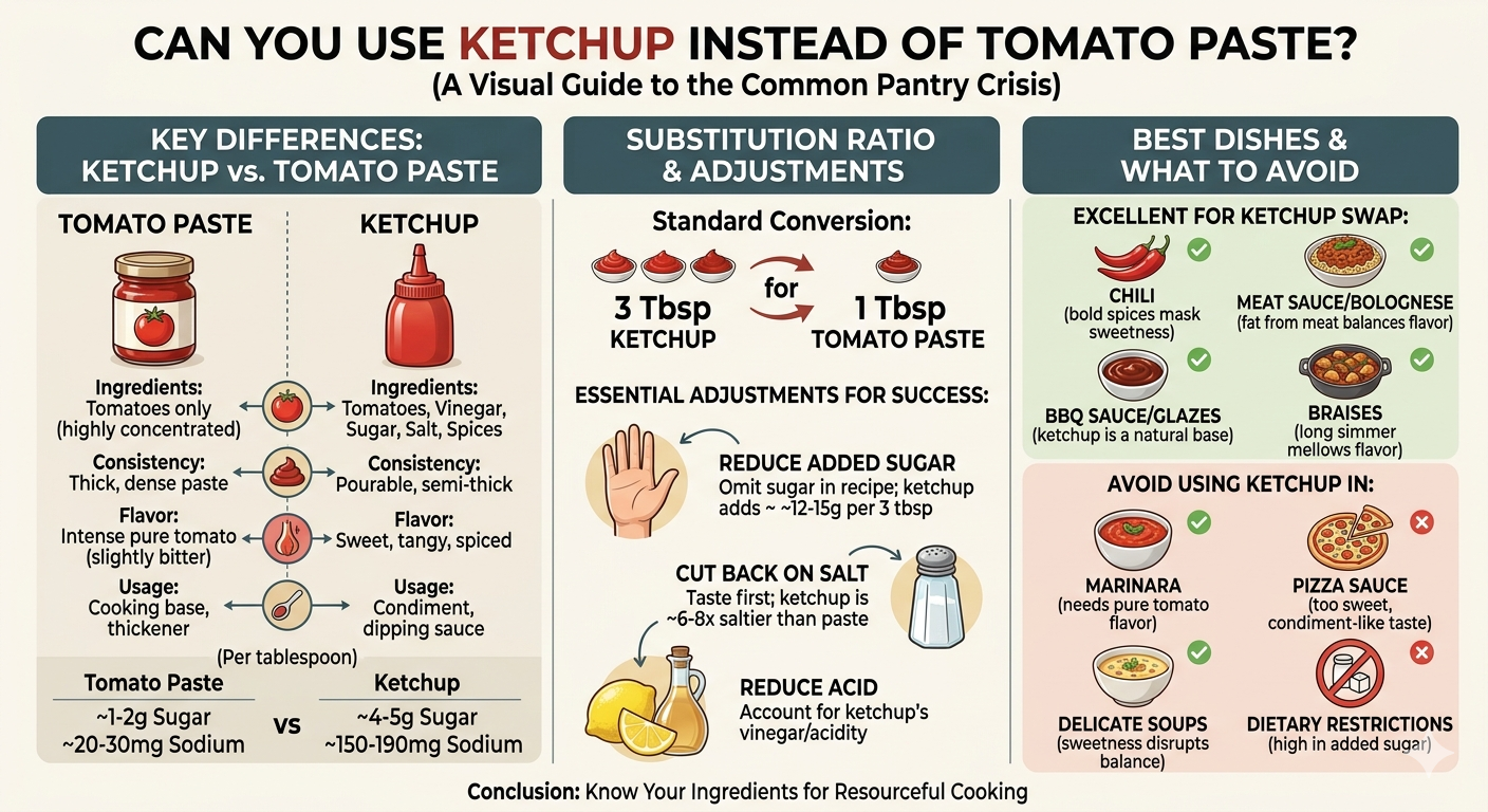 Manquer de concentré de tomate au milieu d’une recette est une crise courante en cuisine. Vous scannez votre garde-manger et repérez une bouteille de ketchup — la question devient immédiatement : peut-il faire l'affaire ? La réponse courte est oui, avec des mises en garde. Le ketchup comme substitut de la pâte de tomate peut être utilisé dans de nombreux plats salés, mais ce n'est pas un remplacement immédiat. Les deux condiments sont fabriqués à partir de tomates, mais ce sont des produits fondamentalement différents avec des profils de saveur, une teneur en sucre et des concentrations différents.